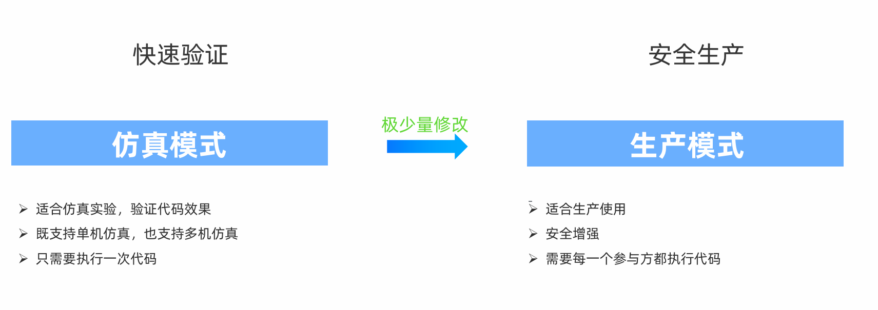 - 仿真模式: 适合进行代码开发和测试,可以模拟多方参与方,并支持单机和集群两种模式。