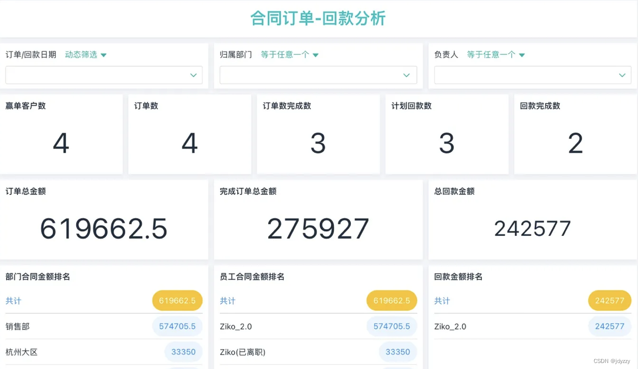 CRM系统应该能够提供丰富的数据分析和报告功能,以帮助用户更好地理解客户行为和趋势,并做出更明智的商业决策。简道云背靠老牌报表软件公司——帆软,因此它的数据分析展示能力很出色。