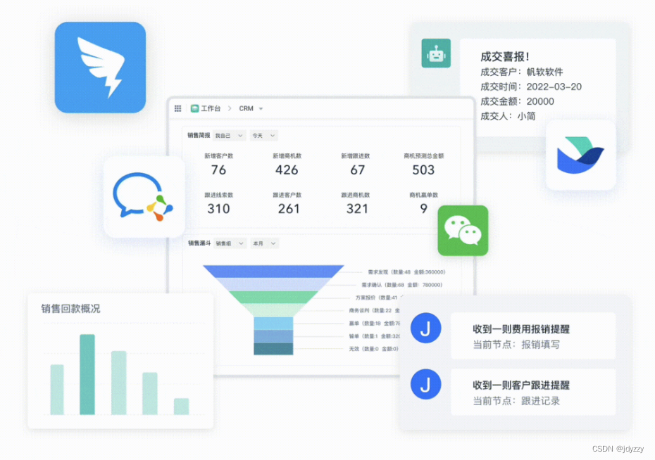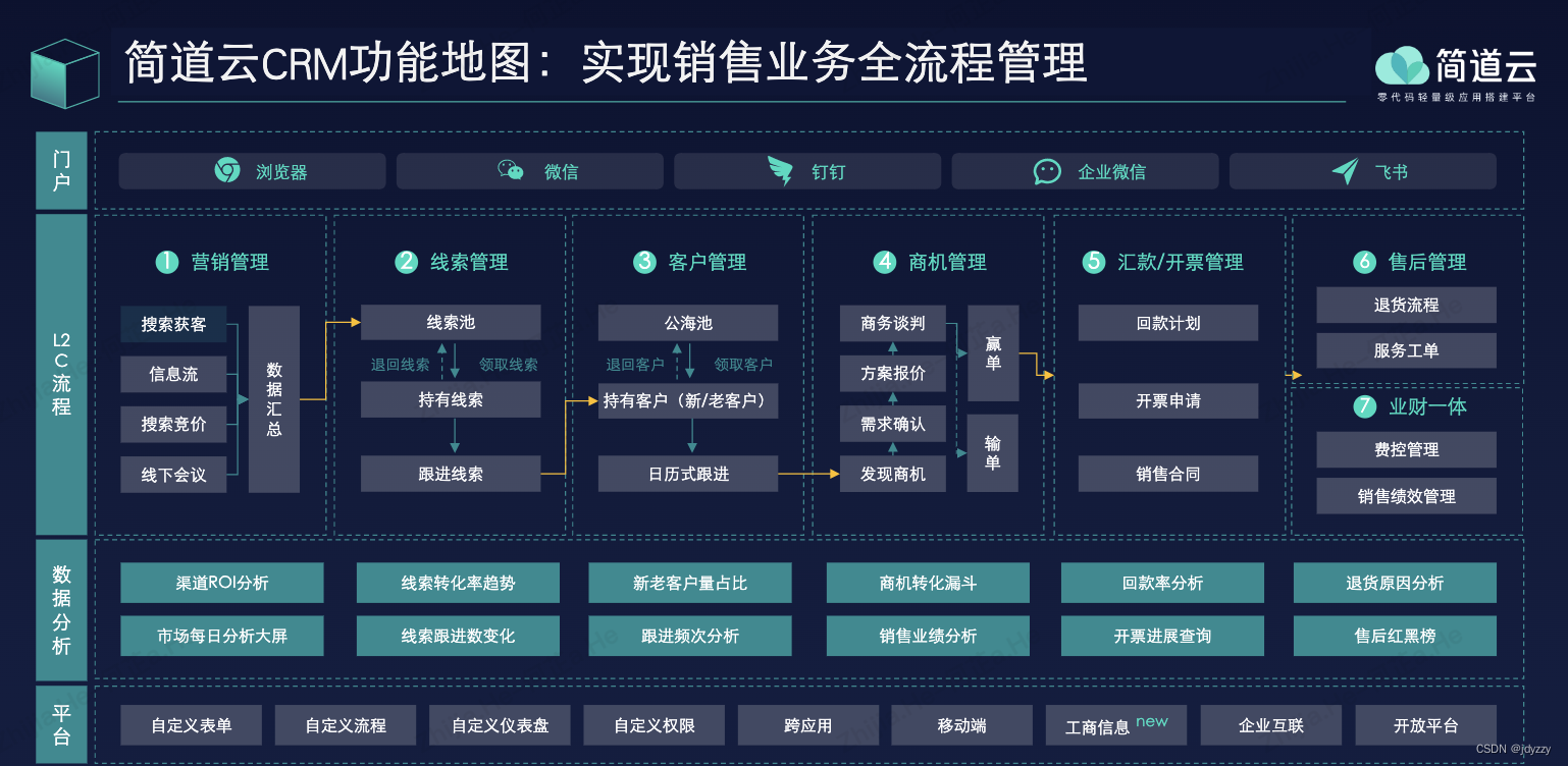 简道云CRM具备全面的功能模块,包括但不限于客户信息管理、销售管理、市场营销、服务支持和数据分析等,它可以帮助销售人员更好地管理客户关系、提高销售效率和销售业绩。