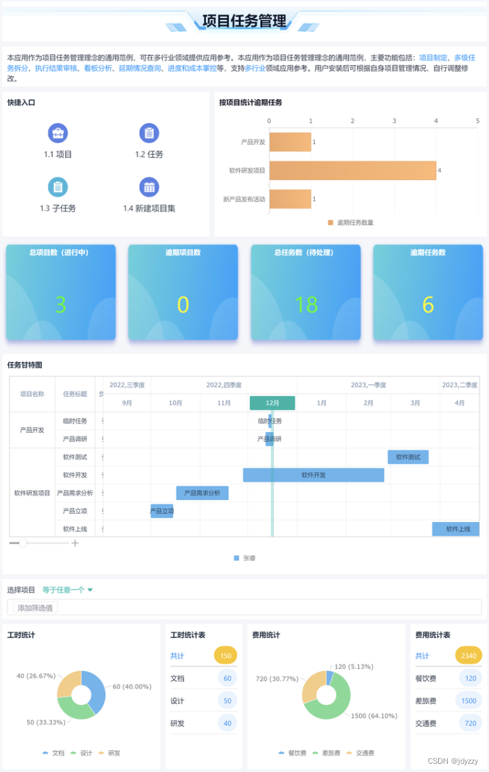 - 看板、甘特图把控任务进度:使用任务数据看板实时查看项目延期情况,甘特图直观展示任务进度,项目整体进度一目了然,及时掌握项目延期风险。