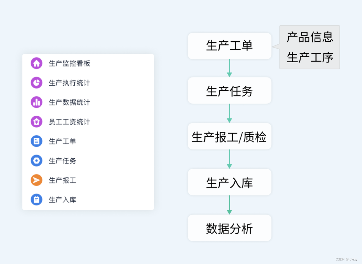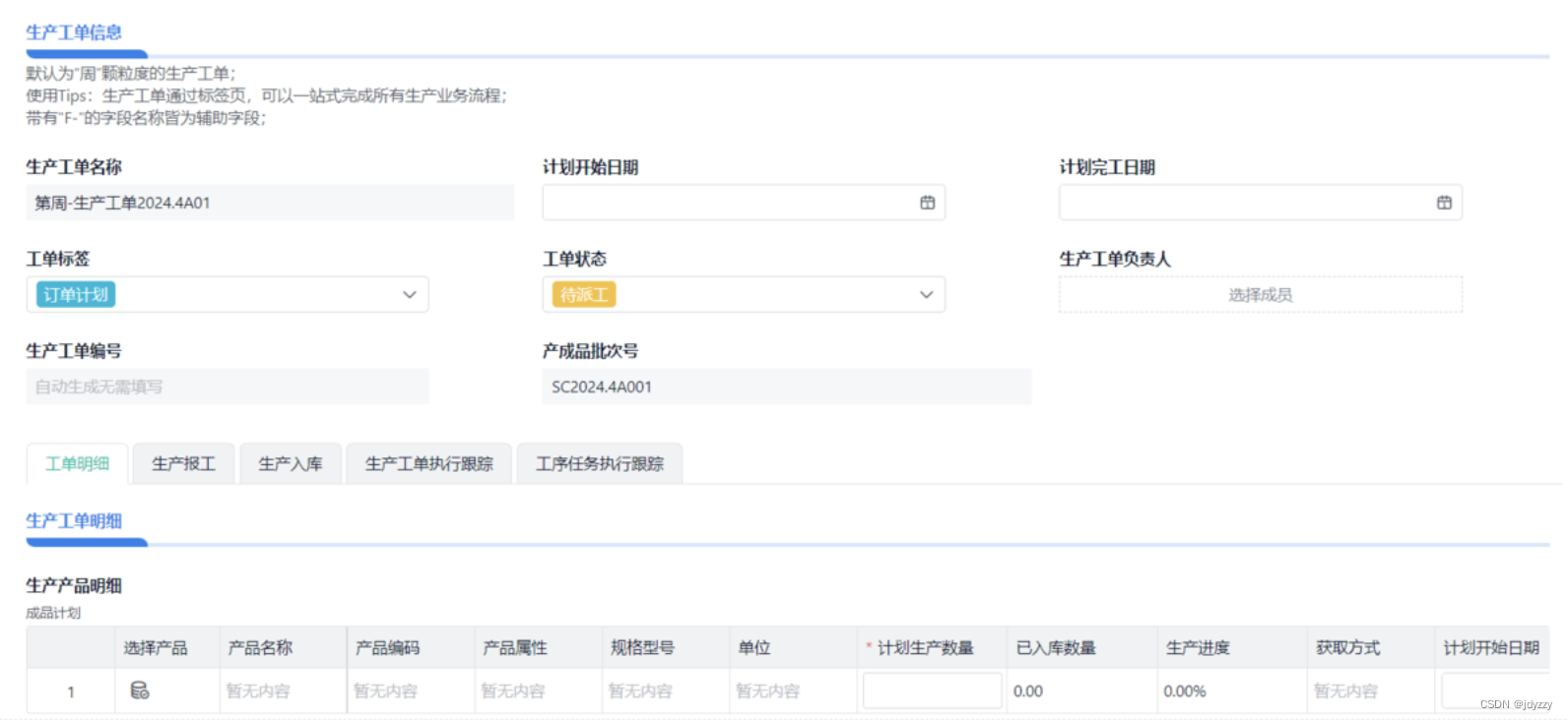 生产管理模块涵盖了一系列关键环节,包括生产工单的生成与下发、生产任务的具体分配、生产报工的实时反馈、生产入库的严格管理以及生产数据的全面统计。这些环节共同构成了一个完整且闭环的生产管理体系,确保了生产流程的顺畅高效。