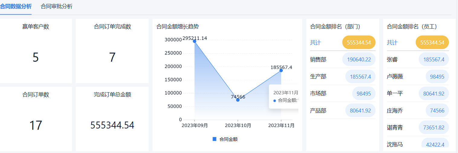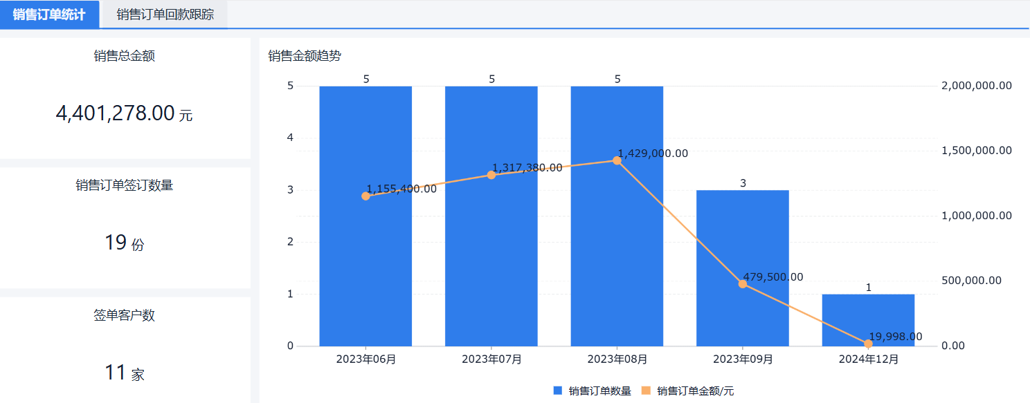 可视化数据管理,比Excel更适合多人使用设置权限,销售团队各自管理自己的客户能和订单、合同、财务数据打通。