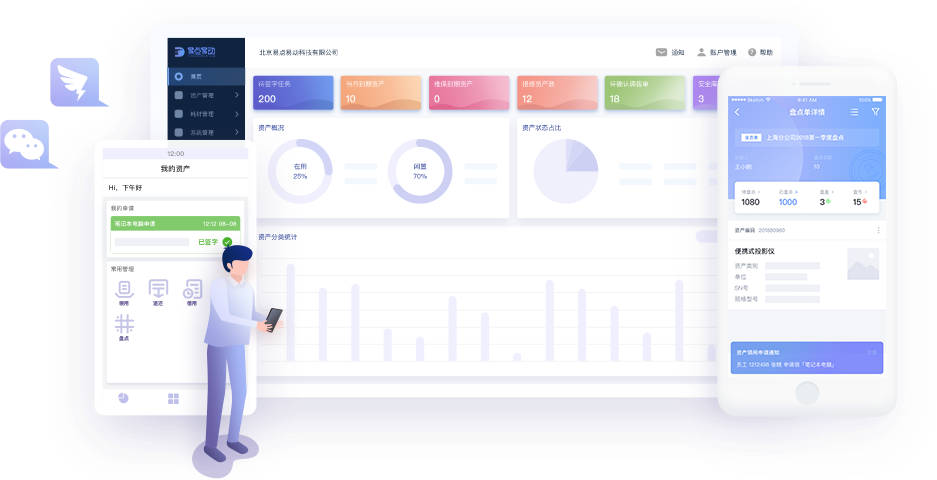 - 移动端扫码盘点,员工可自助申请领用/报修。