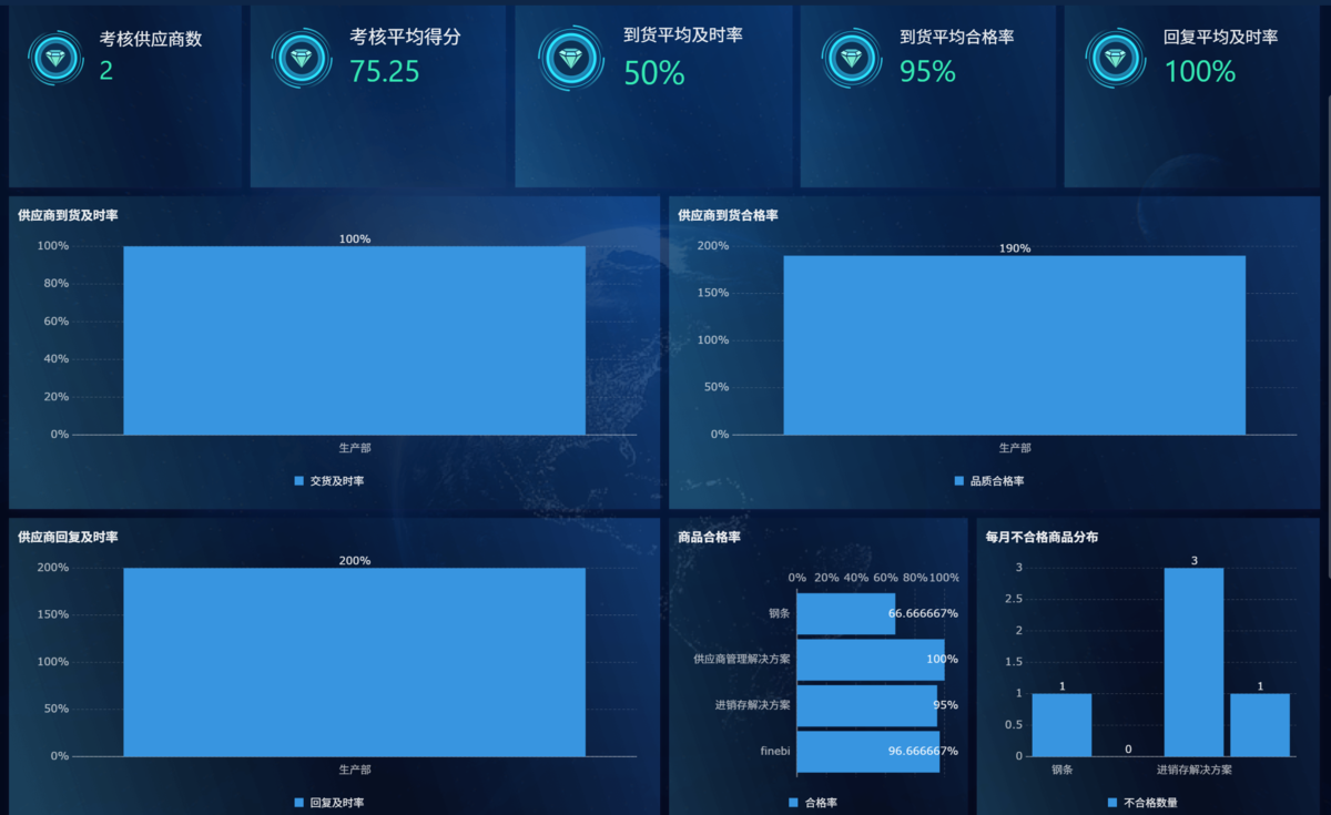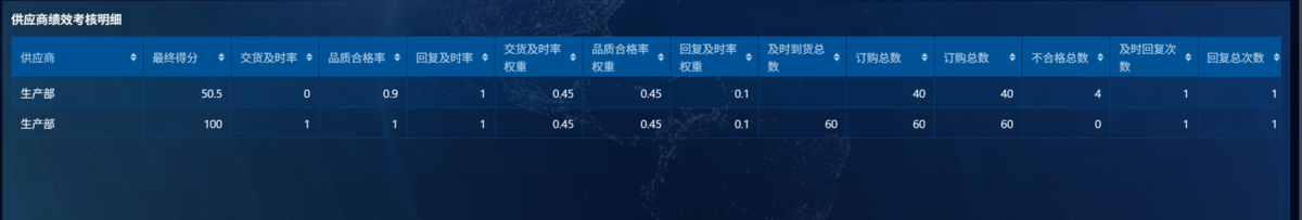 打分完成后,系统会自动按设定的权重计算出每个供应商的最终得分。所有数据集中在一张统计看板中,包括:供应商名称、各项指标得分、最终得分、及时到货总数、各项权重等。