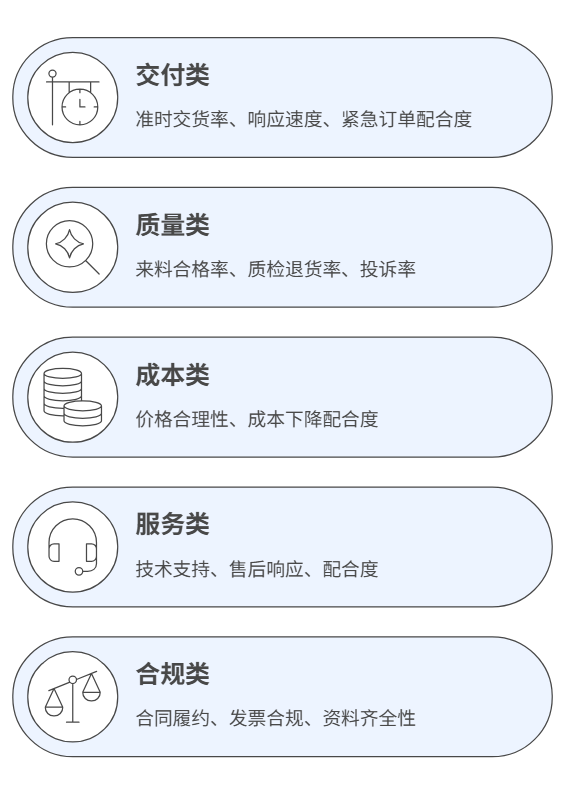 - 交付类:准时交货率、响应速度、紧急订单配合度