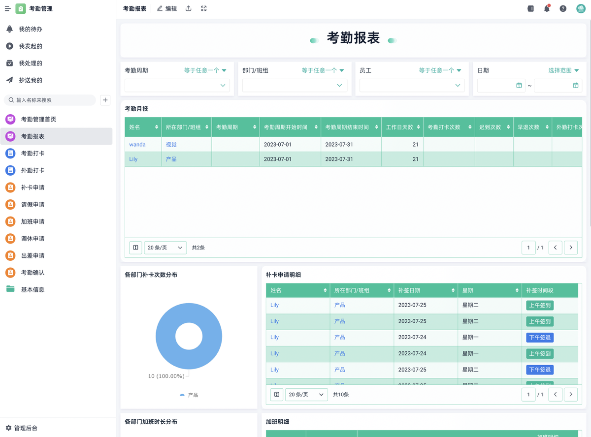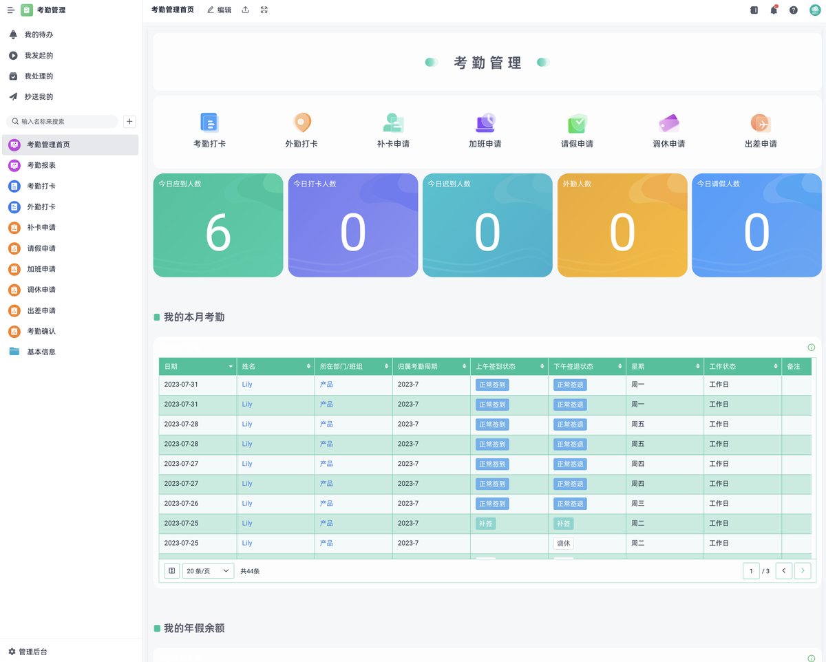 - 考勤数据当天实时更新,系统自动汇总。