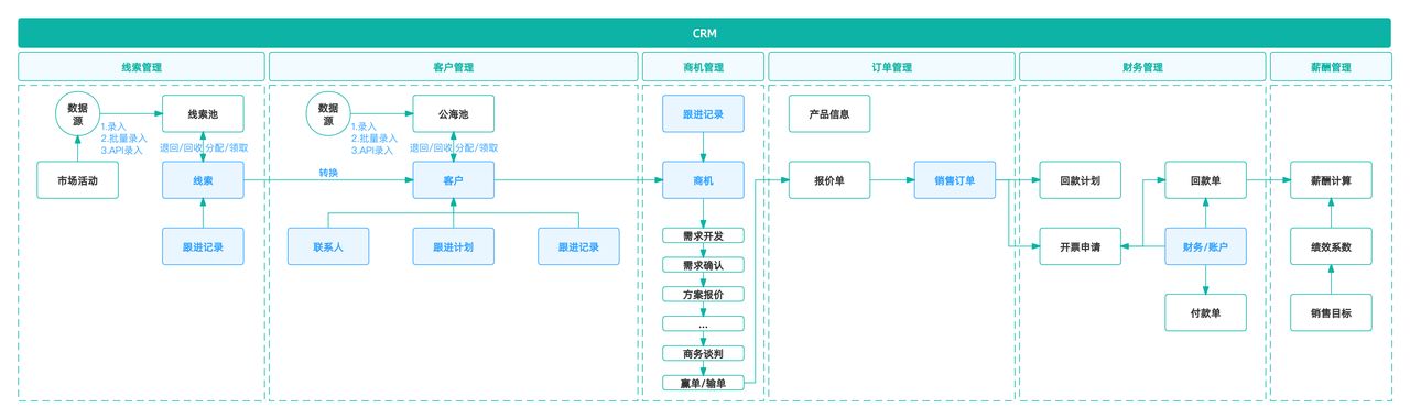 CRM的逻辑是:客户从陌生人变成意向客户、再到成交客户、再到复购客户、再到长期合作,这整个旅程要有人跟进。