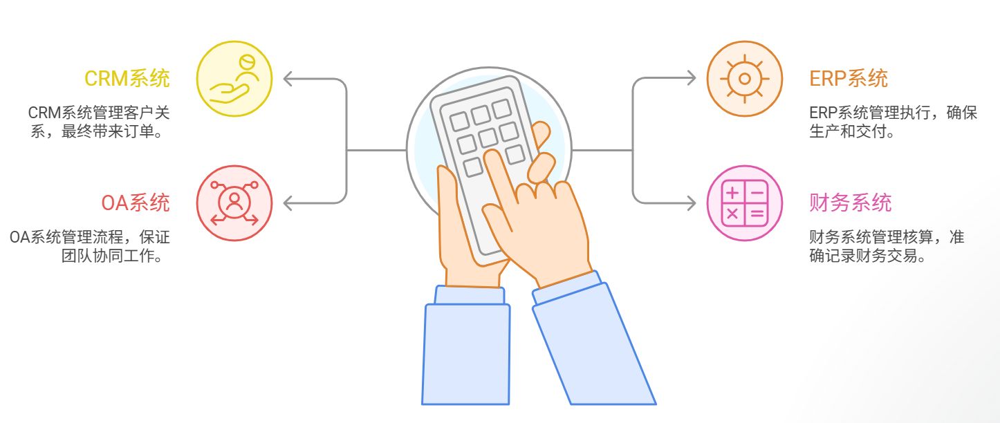 它们是一个完整闭环: 客户下单(CRM) → 订单执行(ERP) → 合同审批(OA) → 收款记账(财务)。