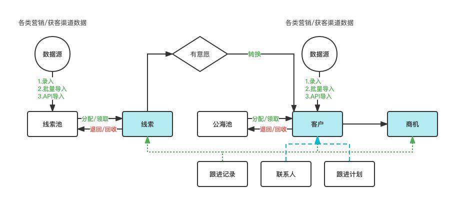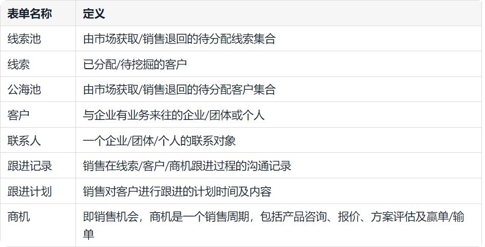 - 「线索」相对于「客户」的区别:「线索」是信息不完整、意向不明确的潜在客户;「客户」是有效的潜在销售对象;当确认营销活动带来的线索有销售可能性时可以转化到客户表单进行跟进,也就是在线索中进行有效客户的筛选。