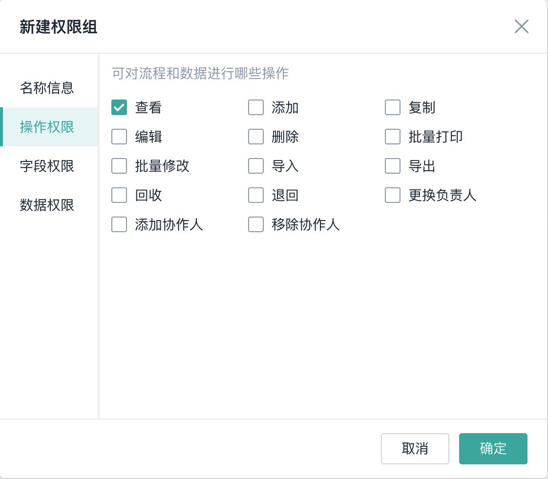 - 自定义权限组:用户根据实际需求,自定义设置更加精确的权限;如设置哪些人员对哪些数据(表单权限)、哪些字段(字段权限)可以进行哪些操作(操作权限)。