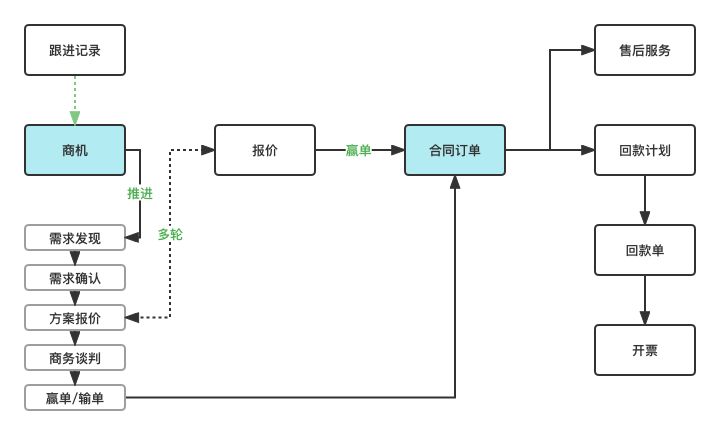 商机是一个销售周期,包括「需求挖掘/确认 >> 方案报价 >> 商务谈判 >> 赢单/输单」整个售中流程: