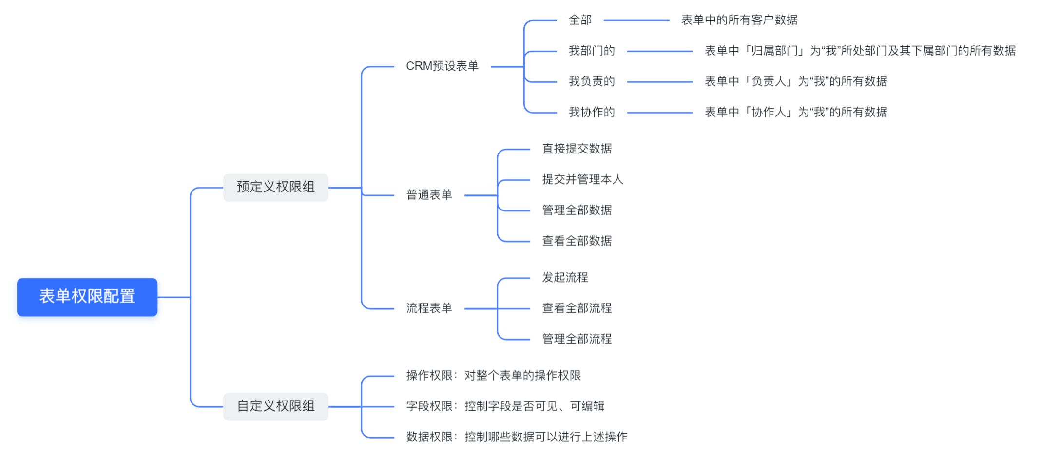 - 预定义权限组:用户常用表单权限,面向所有字段,直接添加部门/成员即可完成配置;