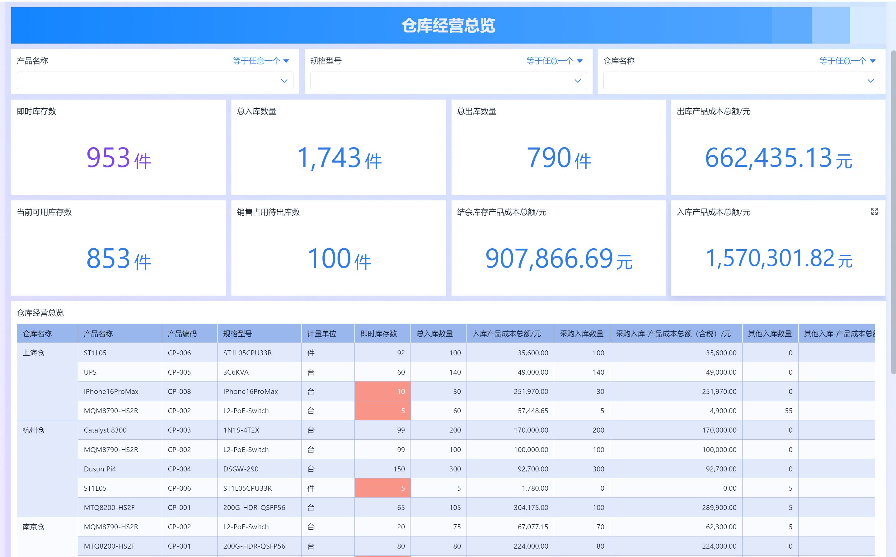 比起在 ERP 里一条条查数据,这张表能直接告诉你:北仓快缺货的 A 产品可以从南仓调拨,滞销 B 产品要做促销清理。