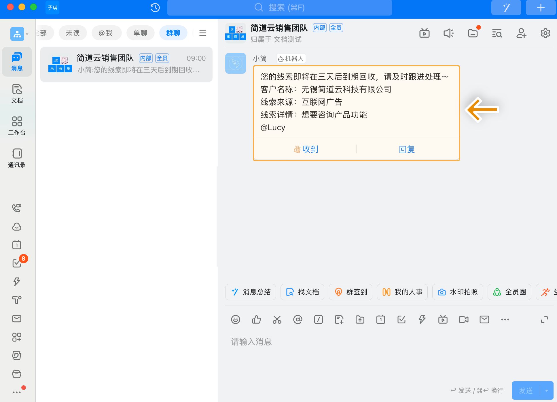 消息中直接带拨打电话和CRM详情链接,销售一键就能联系客户。