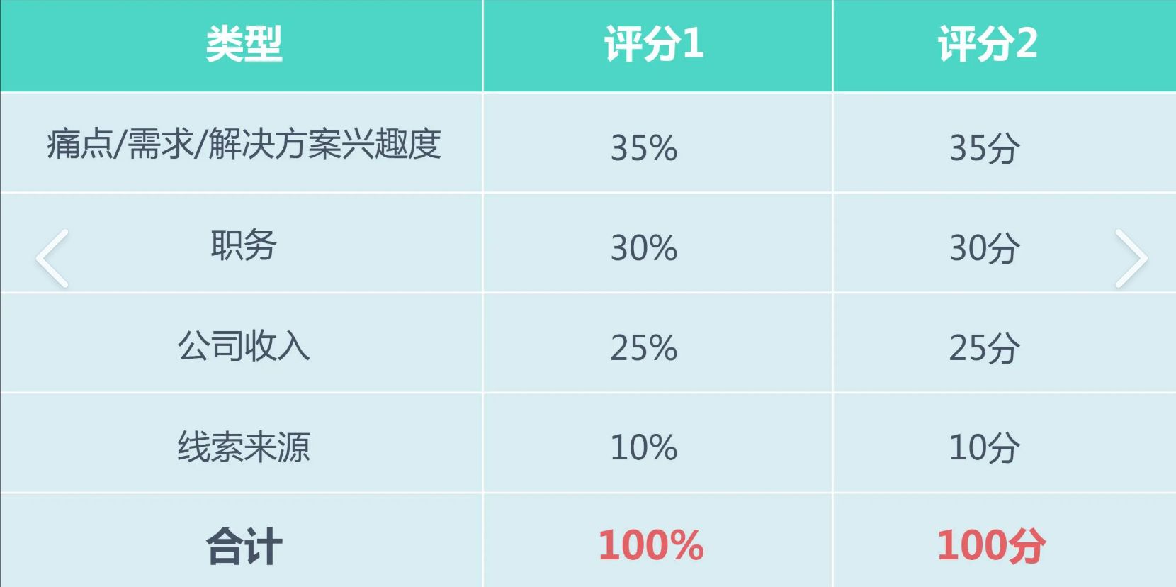 - 来源评分:官网直客5分,参加活动4分,下载白皮书3分,其他渠道2分