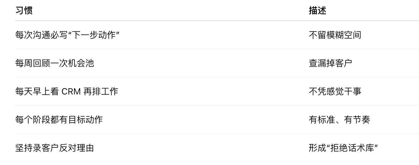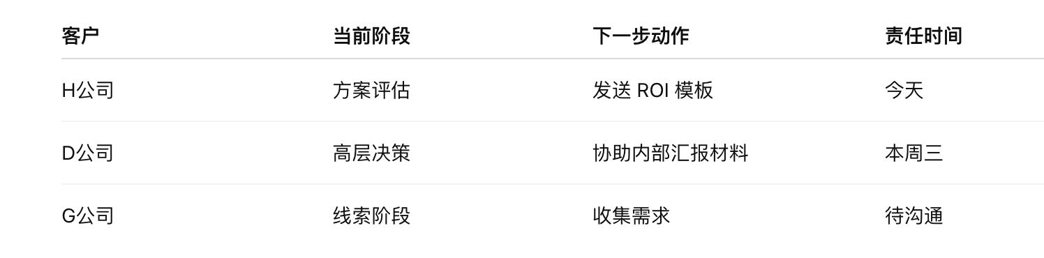 高手把 CRM 当决策系统: “客户 A:预算 30W,决策人是 COO,上线时间 6 月,当前阶段:验证 ROI,预计两周推进 DEMO。”