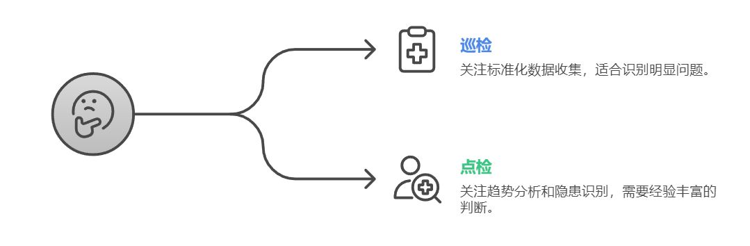 打个比方,巡检像每天量体温、测血压,只要按标准记录就行;点检更像医生综合症状、病史、生活习惯来判断身体状况,决定是否需要干预。