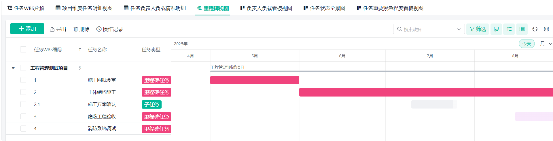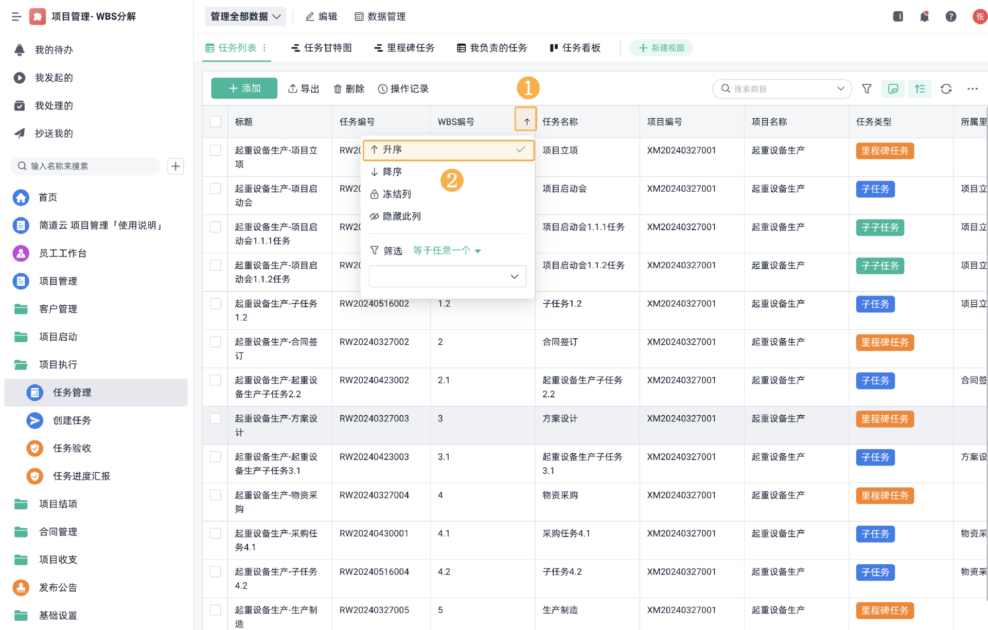 在管理任务的表单视图中,将任务按照 WBS 编号“升序”进行排序,任务即可有序展示在表格中: