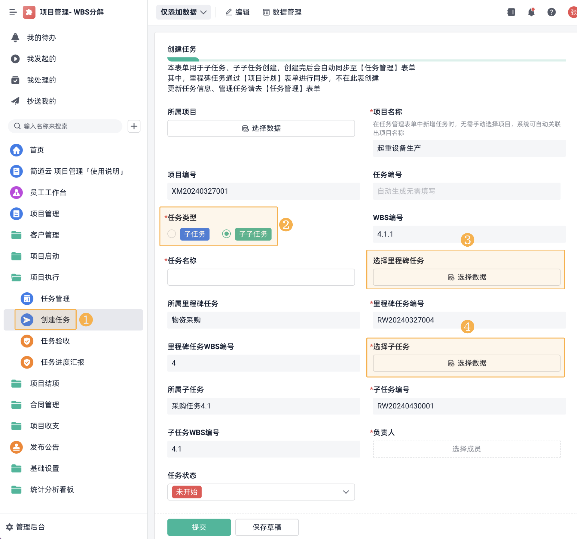 若选择了子任务进行创建,需要选择对应的上级里程碑任务,选择后自动联动出里程碑任务编号,子子任务不需要关联,所以子子任务编号为空。