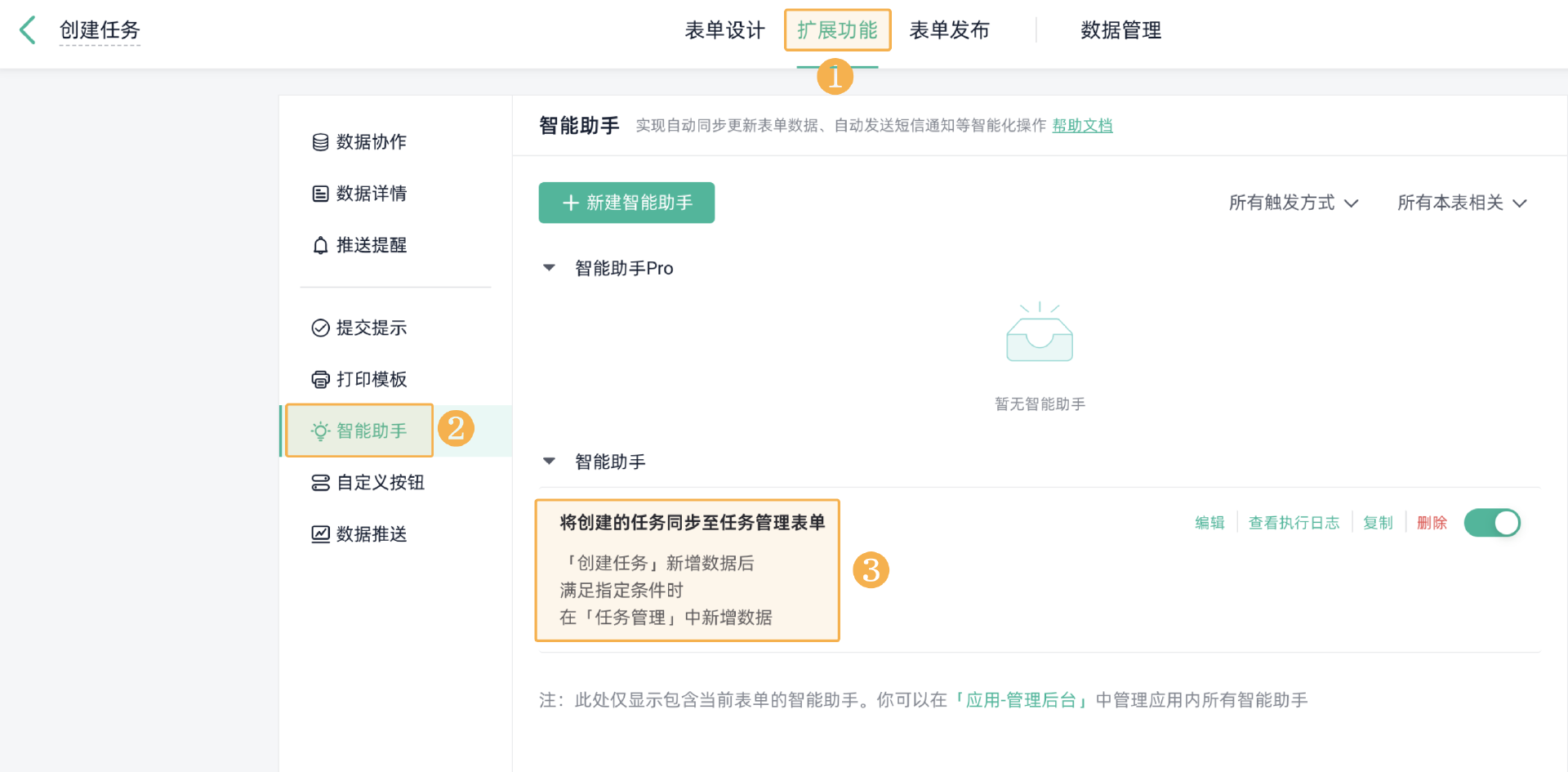 在扩展功能处,通过智能助手将创建的任务同步至【任务管理】表单中: