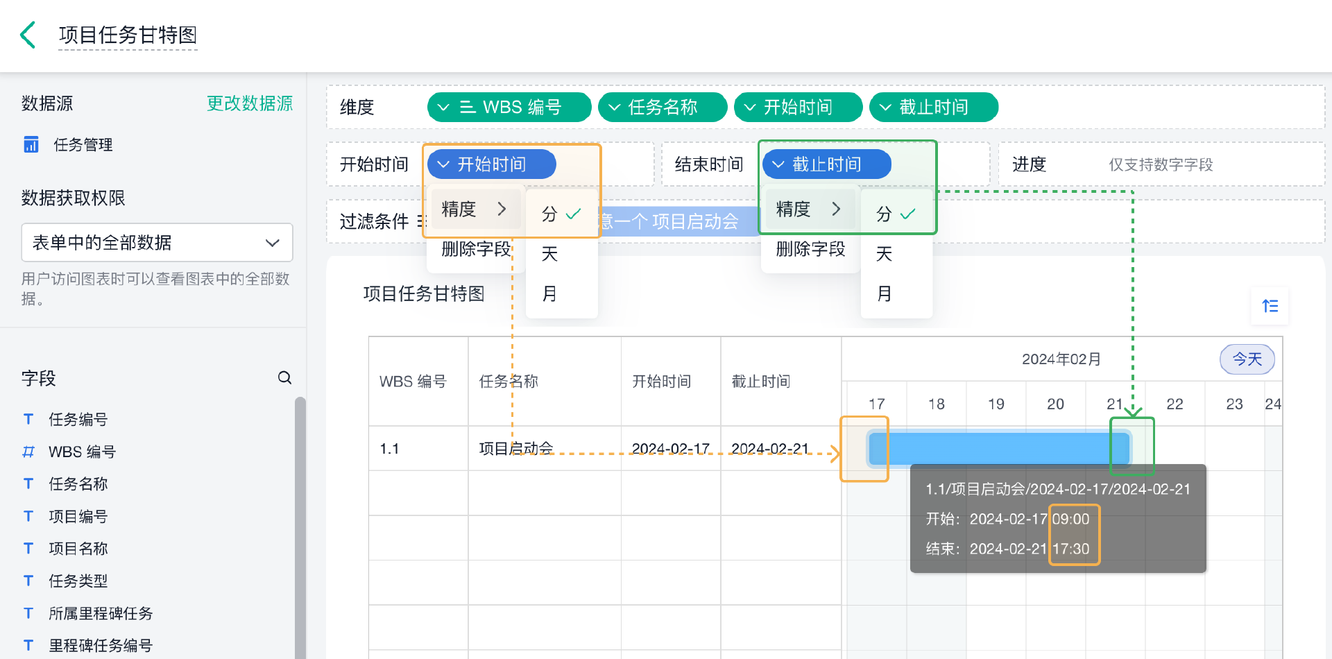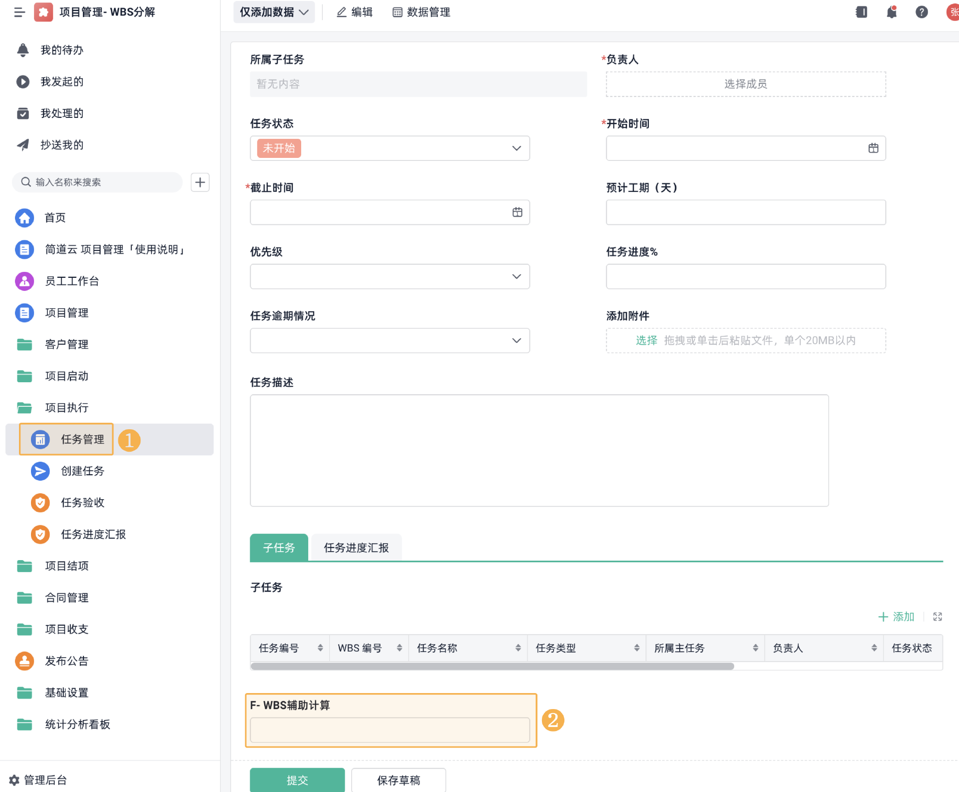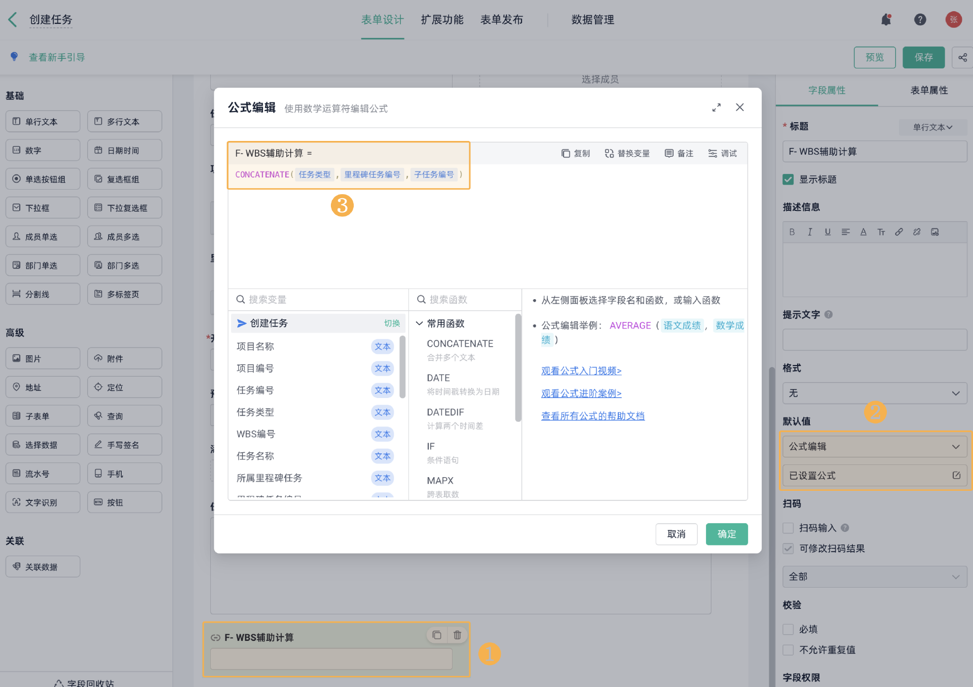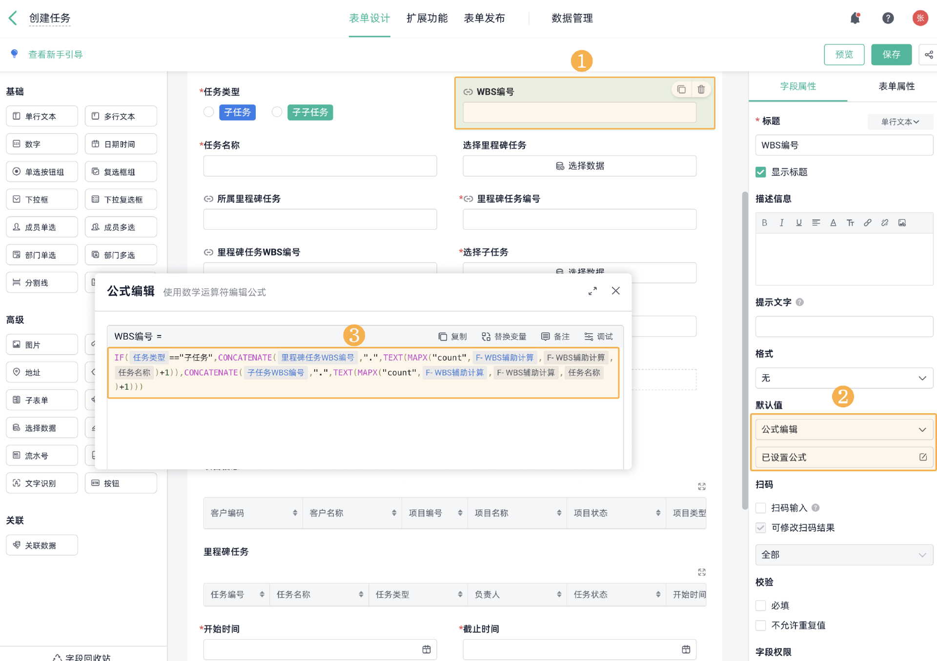 创建一张任务管理表单,用于集中管理所有类型的任务,在任务管理表单中创建一个文本辅助字段,用于创建任务时计算 WBS 编号: