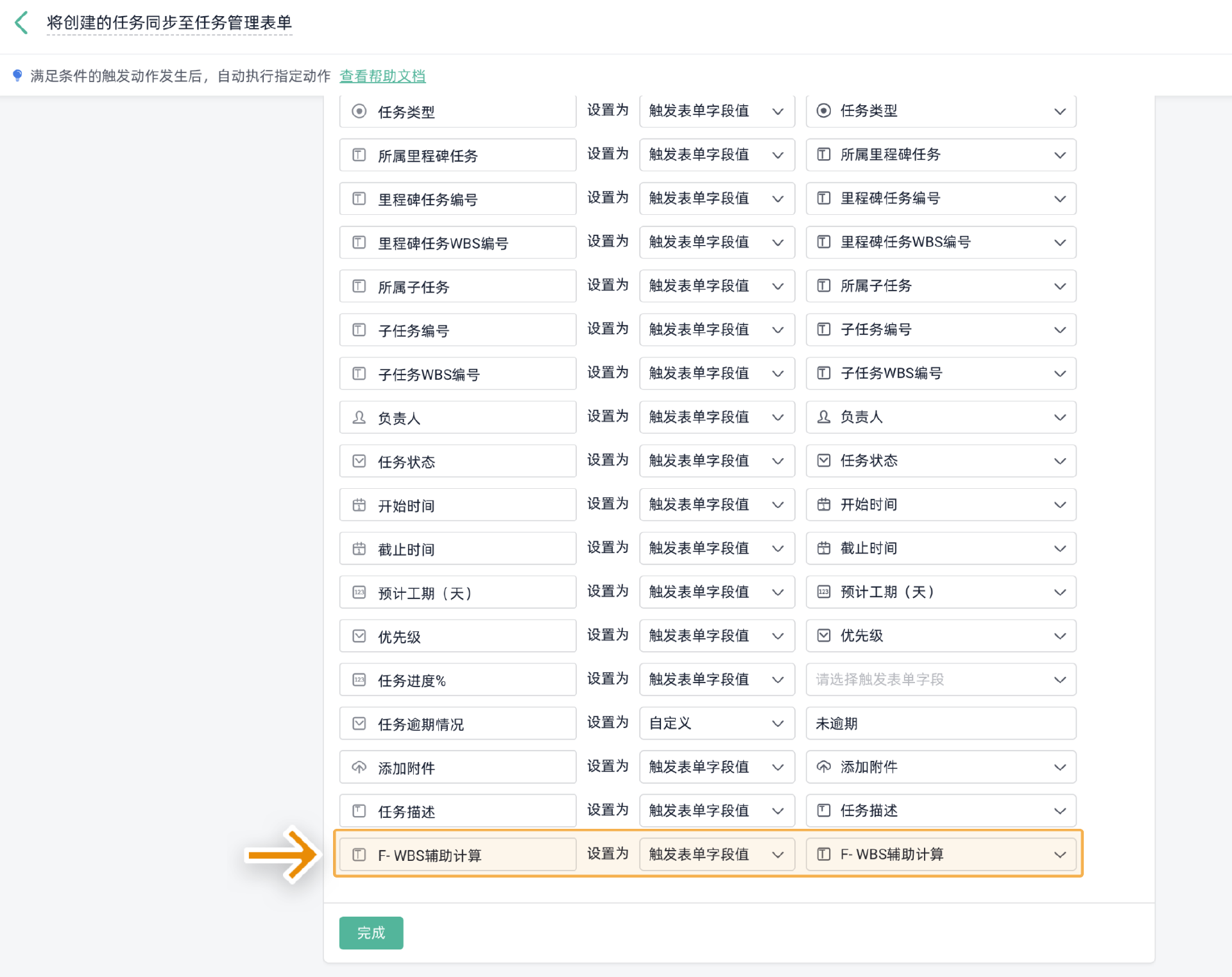同步时,需要将辅助字段的数据一起同步过去,否则后续任务创建时 WBS 编号无法计算得出: