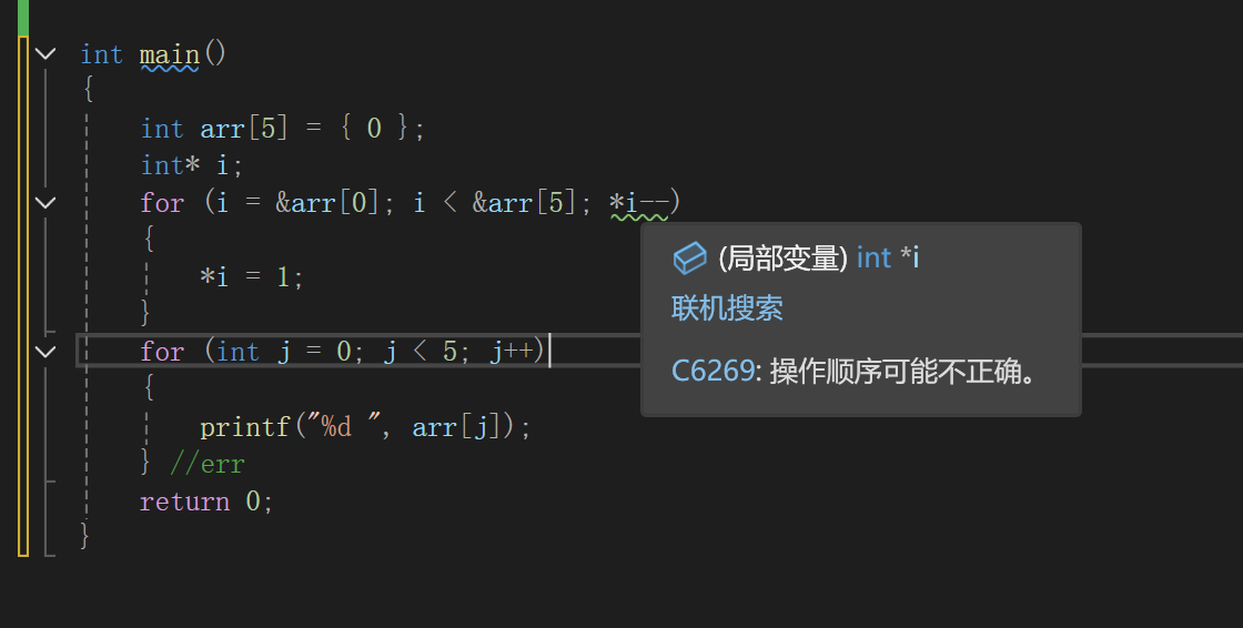 for (i = &arr[0]; i < &arr[5]; *i--)