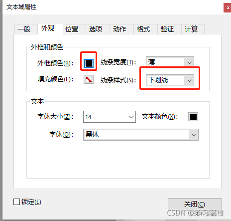 1、在Adobe Acrobat DC中设置了bz-line1、bz-line2、bz-line3三个文本域,并分别设置其属性(双击该域即可,文字大小样式等都可以设置)。如下图所示: