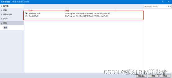 右击引用,选择RevitAPI.dll和RevitAPIUI.dll,并引入到当前Visual Studio项目中。RevitAPI.dll和RevitAPIUI.dll在Revit 2018的安装目录下。