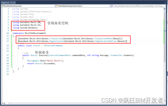 在项目文件添加Revit的引用,分别为Autodesk.Revit.DB和Autodesk.Revit.UI,并写入外部命令的代码。