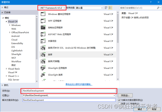新建Visual Studio项目,按照项目需要自定义修改名称,选择框架为“.NET Framework 4.5.2”,最后点击确定。