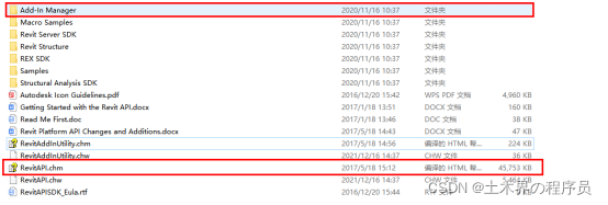 Revit SDK包含RevitAPI的帮助文档以及带源码的案例,Revit SDK需要与Revit的版本保持一致。Revit SDK中的Add-In Manager是Revit的官方插件,用来加载revit的插件,RevitAPI.chm是RevitAPI的帮助文档。