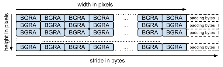 输入数组应该是一个打包的字节数组(每个通道一个,如函数名称所期望的那样)。stride对应于从一行跳转到下一行所需的字节数。例如,BGRA布局是: