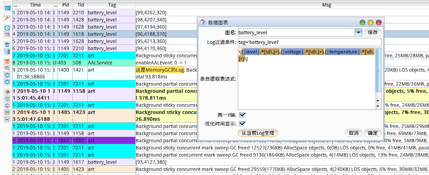 点击按钮“从当前Log生成”, 这样自动完成数据图表的的分析设置。