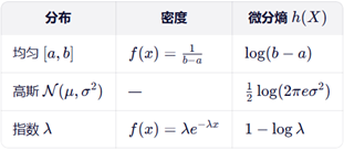 - 在给定约束下(如均值、方差),使微分熵最大的分布最“无偏”;
