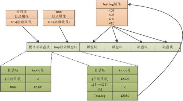 “举个例子来说吧: 有人要读取 /tmp/test.log这个文件, 查找次序是这样的:根目录inode-根目录磁盘块-tmp目录inode-tmp目录磁盘块-test.log的 inode-读取磁盘块”