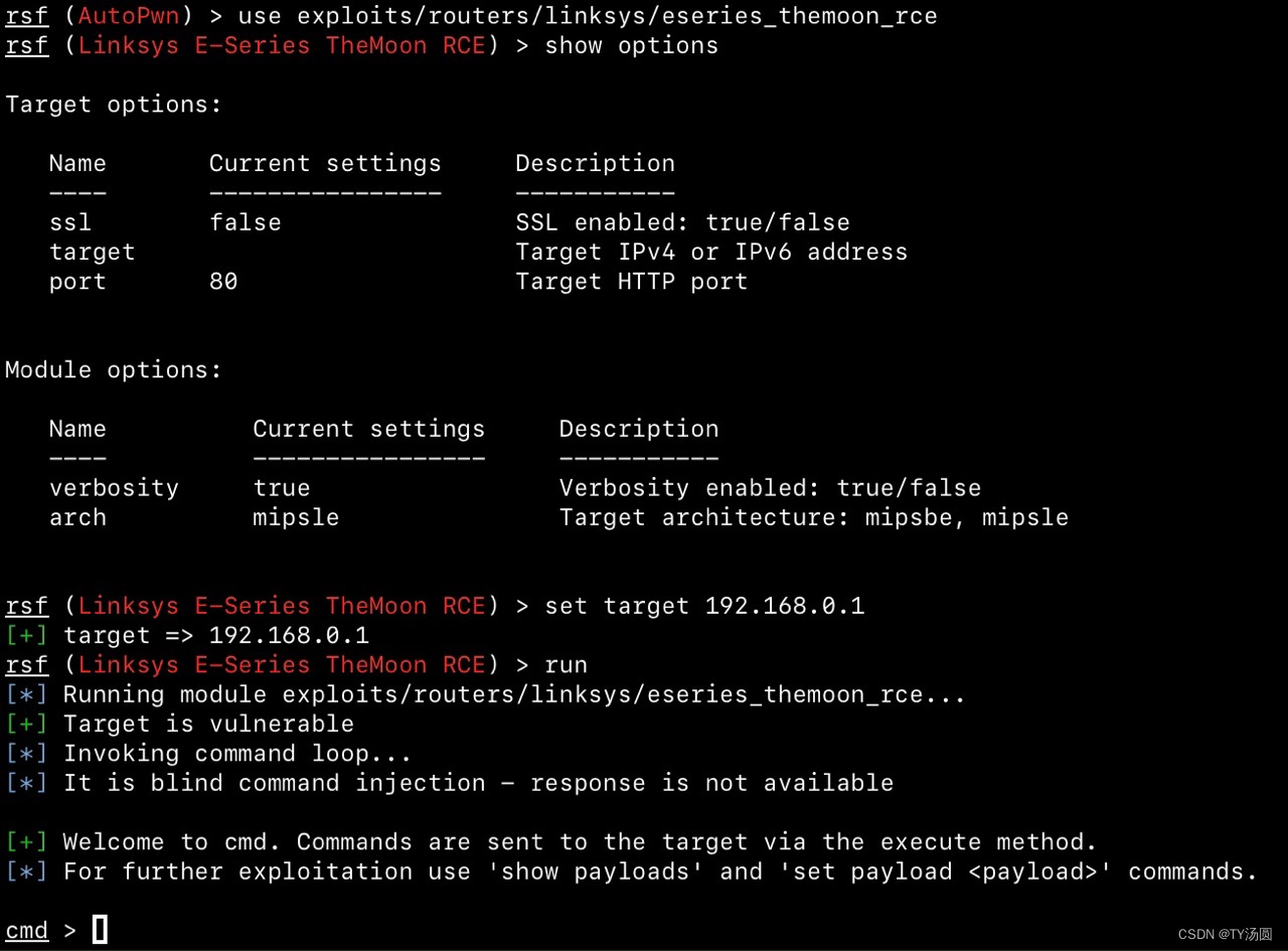 从扫描结果可以看到该路由器存在eseries_themoon_rce漏洞,接下来就得Exploits模块出场了