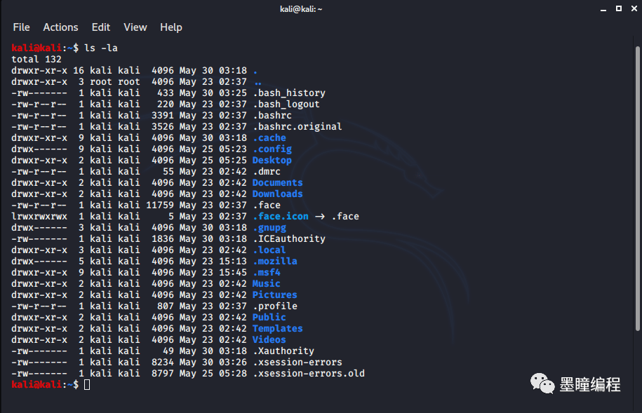 要想列出目录中所有隐藏和非隐藏的文件,请使用ls -la 命令,因为’la’命令现在会显示隐藏的文件。