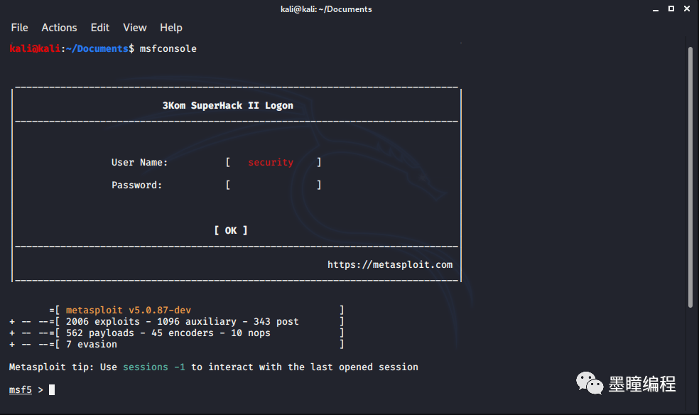 要在你的终端访问Metasploit框架,运行msfconsole 命令,花哨的Metasploit框架就会弹出msf 5 > shell来运行命令。