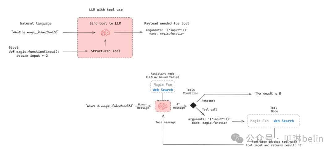 在 LangChain 官方文档《How to migrate from legacy LangChain agents to LangGraph》一节中,通过 magic_function(3)的示例,展示了语言模型(LLM)如何调用外部工具的完整流程,包括工具的定义、与模型的绑定、工具调用的生成与执行,以及最终结果的返回。