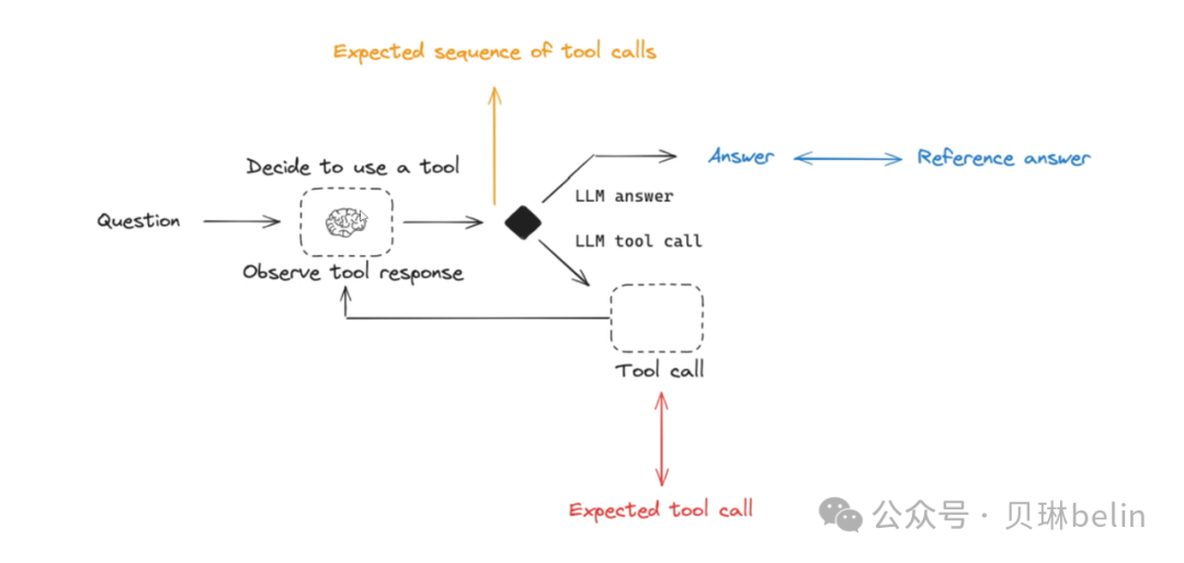 在评测 Agent 时,对他的工具调用决策与行为的评估逻辑是:当 Agent 接收到用户问题后,语言模型需要判断是否使用工具,并做出相应的调用。如果调用工具,则进入工具执行阶段,并基于结果继续推理;否则直接回答。评测过程不仅关注最终的回答是否接近参考答案(蓝色箭头),还关注模型是否按预期正确地调用了工具(红色箭头)以及调用顺序是否合理(橙色箭头)。这体现了对 Agent 的行为路径和最终输出的双重评估标准。