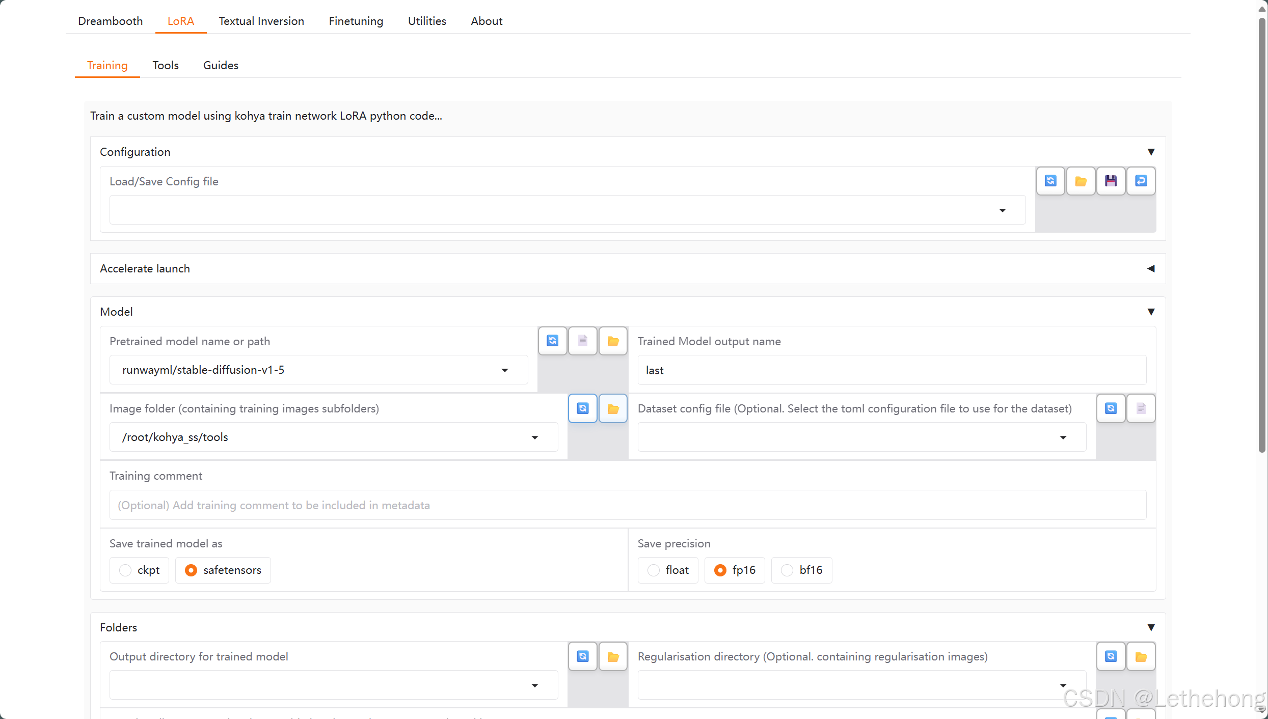 - Model–>Pretrained model name or path: 这里配置你的SD基础模型,我们这里用的1.5,需要指定其路径;关于SD1.5模型的下载,在1.1步骤中也有响应链接;