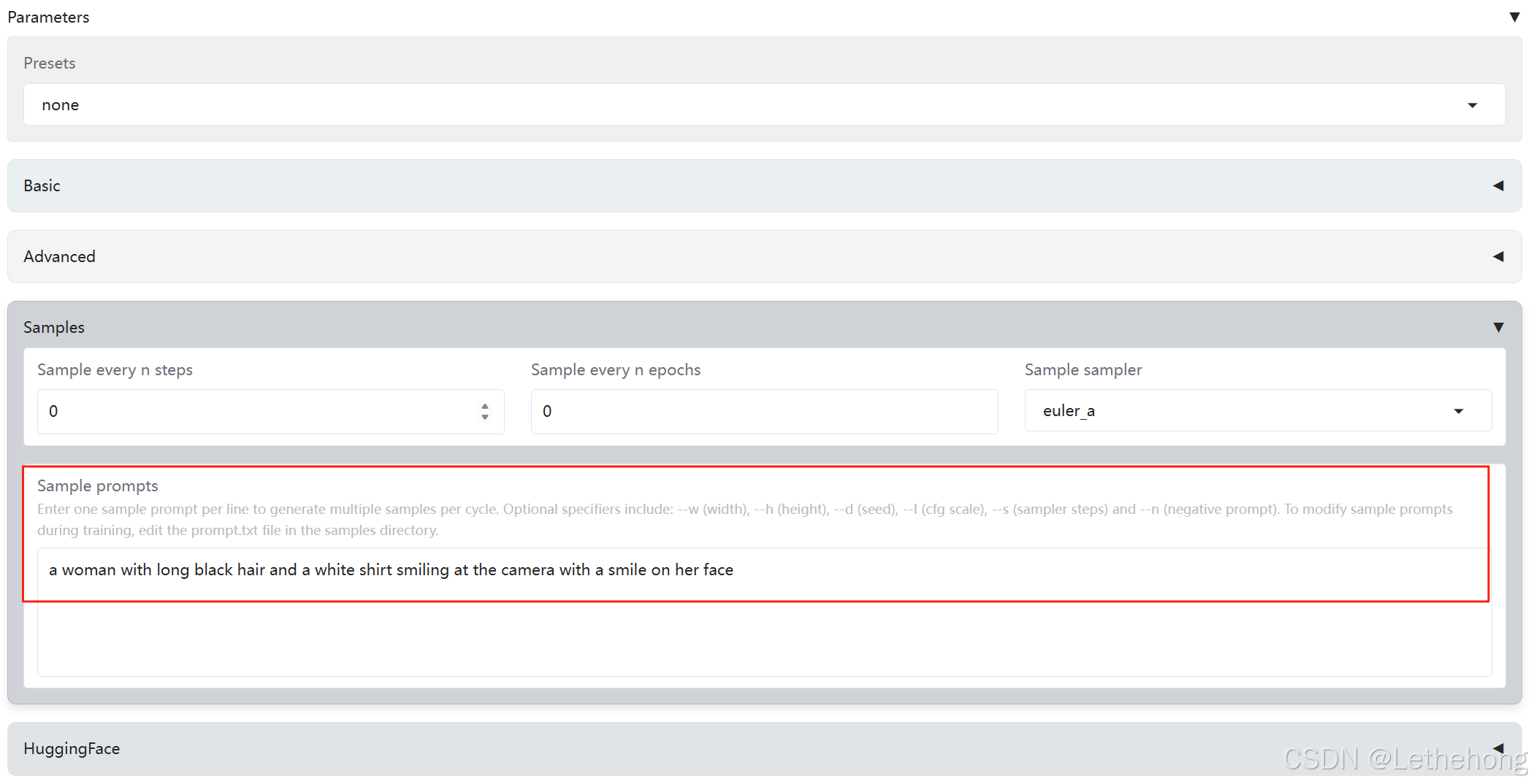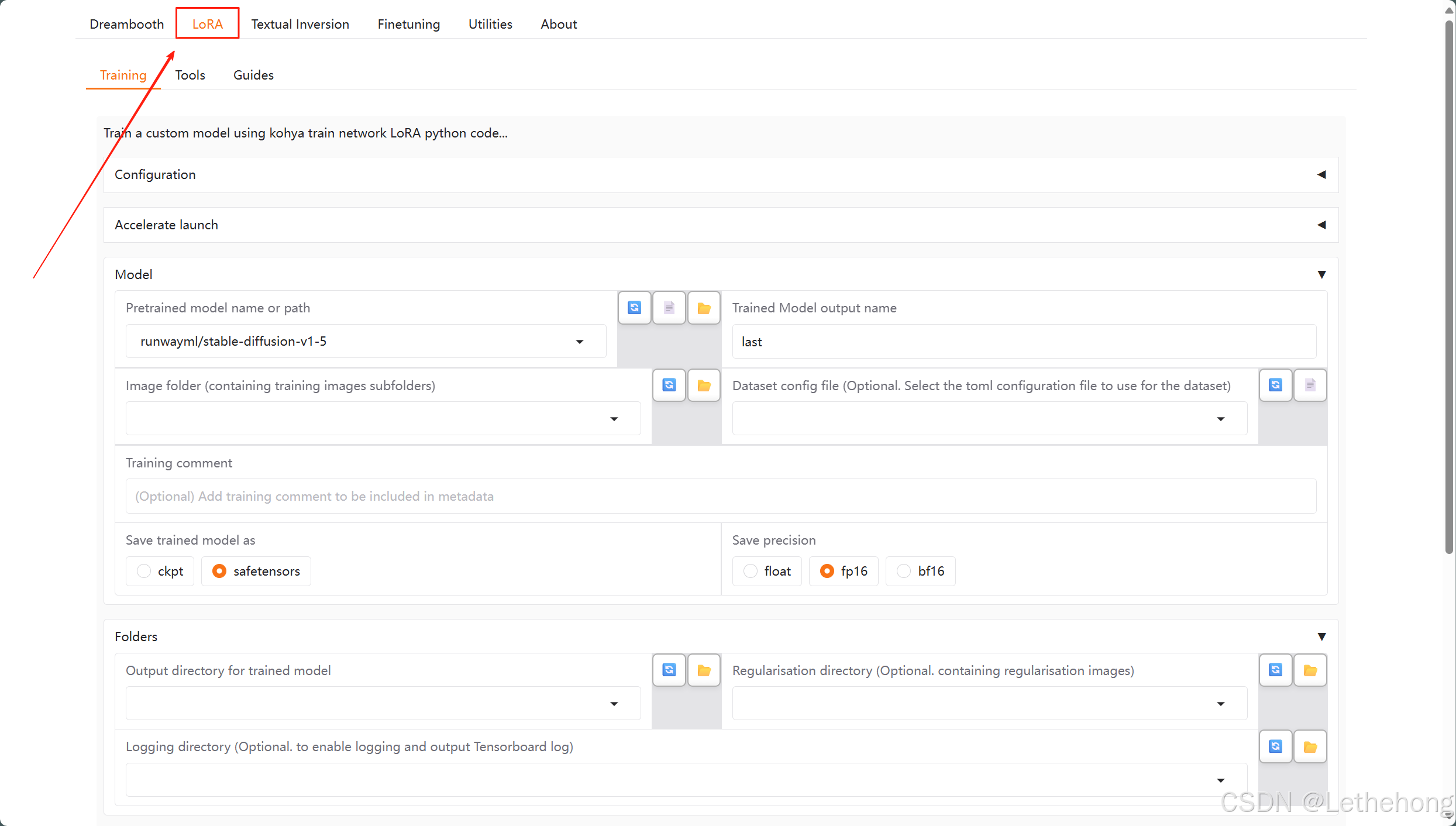 选择最上面的LoRA选项卡,然后需要在页面 内配置一些参数。