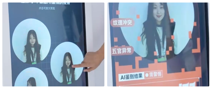 观众在合合信息人脸鉴伪展台体验“真假对决”:其中一个是真人,还有两个是ROOP实时伪造,表情纹路及其相似,肉眼难辨,但AI人脸鉴伪模型能即刻判断真伪,并标出伪造区域。