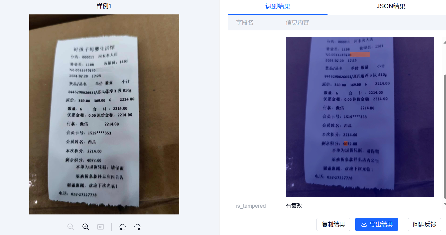 TextIn通用篡改检测平台采用自研深度神经网络技术,基于百万级数据训练,支持财务凭证篡改检测、商场机打小票篡改检测、以及身份证、护照、行驶证、驾驶证、港澳台证件等数十种常用卡证篡改检测。平台可在毫秒级时间内完成一次鉴定,在适配场景下,误检率低至千分之一。目前已落地证券、银行等场景。