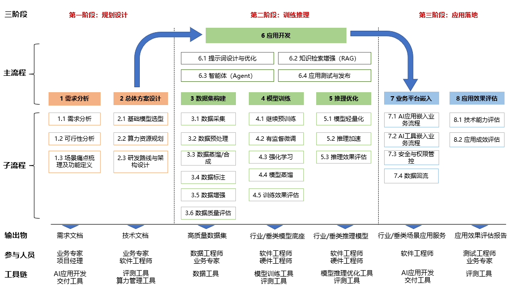 AI应用落地分为三大阶段共8个子步骤,分别为: