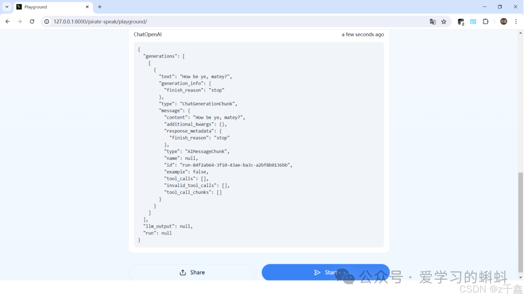 最后,您可以在浏览器中访问 http://127.0.0.1:8000/pirate-speak/playground/ 来查看和使用应用。