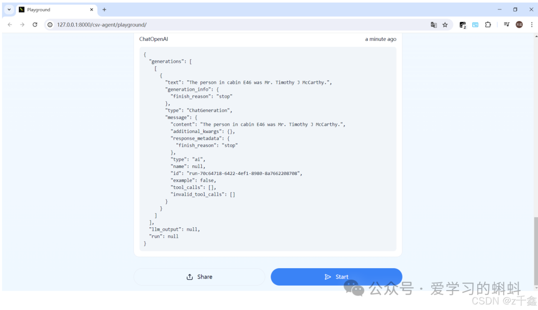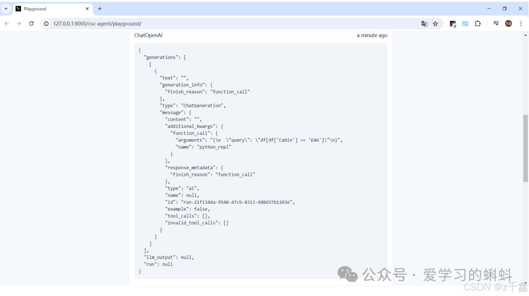 启动应用后,您可以在浏览器中访问以下链接来查看和使用 CSV-Agent:http://127.0.0.1:8000/csv-agent/playground