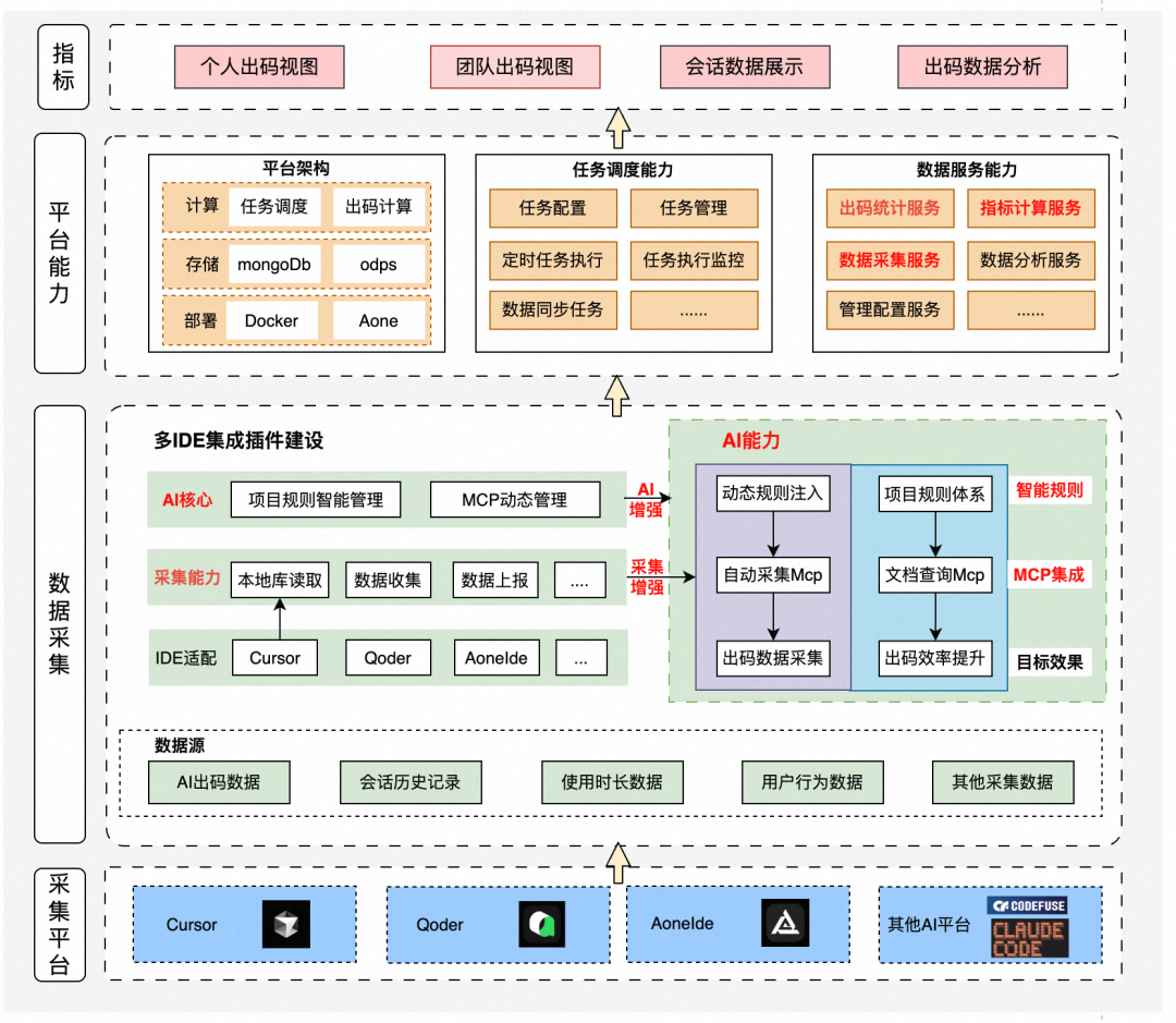 采集能力:包括本地库读取(Cursor)、指标数据收集(Tab采集、AI会话数据采集、AI出码数据采集等)、数据处理及上报等能力;为不同的开发工具提供统一的数据上传处理服务。