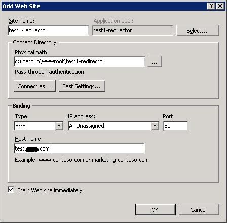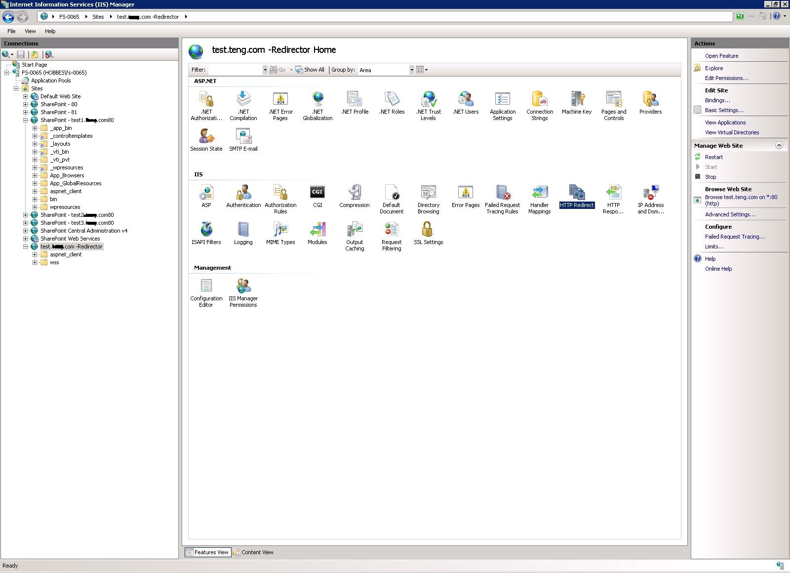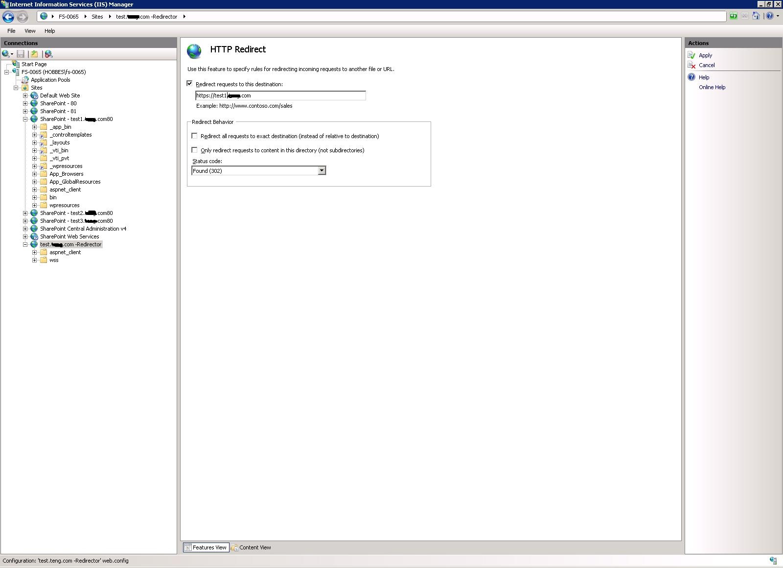 So this setup means that all request for my test1..com over http will be coming to this webapplication, now lets configure redirection for these requests coming over http to https. Select the dummy webapplicatin and select ‘Http Redirect’ on the right hand side pane.